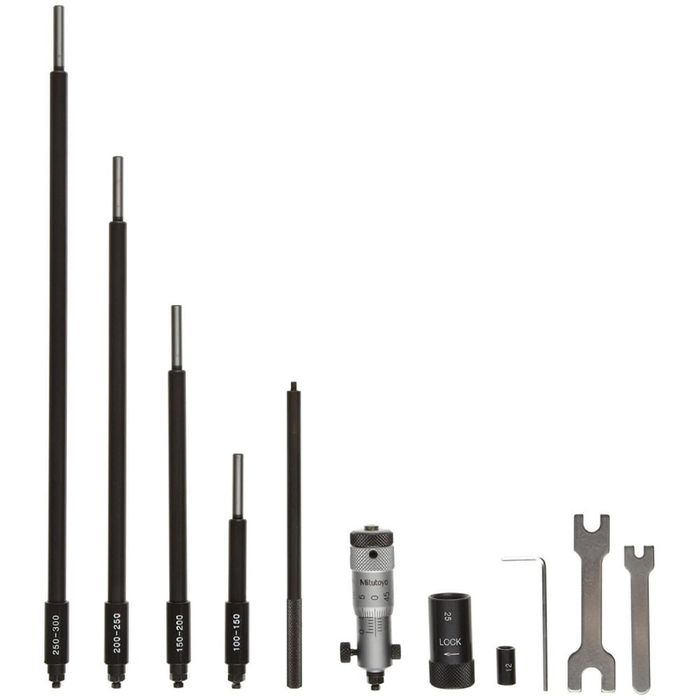 The Mitutoyo interchangeable rod inside micrometer makes measuring inside dimensions of different ranges of cylinders, rings and parallel surfaces faster and easier. The micrometer head is constructed with precision, balance and durability in mind. The sizes of interchangeable rods can be adjusted with spacing collars, and an extension rod allows for measurements of deep bores and holes.