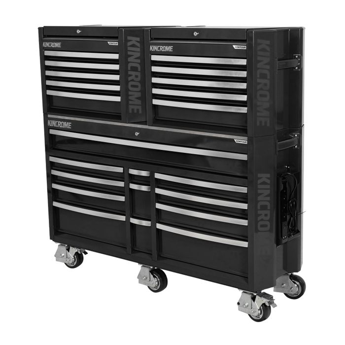 CONTOUR® storage comes standard with a range of premium features, including; the chamfered screen printed Kincrome side panels, ’Automatic Drawer Retention System (ADRS)’ locking system, heavy duty steel side handles, side folding work trays (including magnetic power boards), stainless steel worktops & heavy duty swivel castors for easy manoeuvrability.