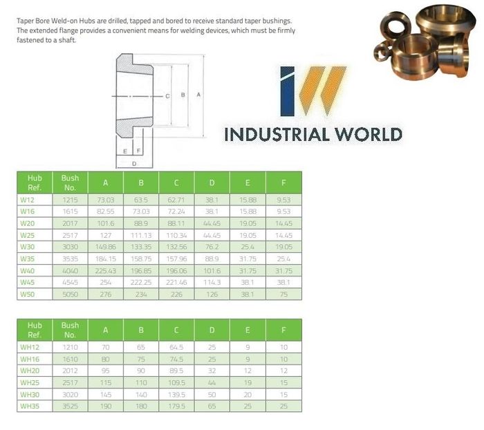 Taper Bore Weld-on Hubs are drilled, tapped and bored to receive standard taper bushings.