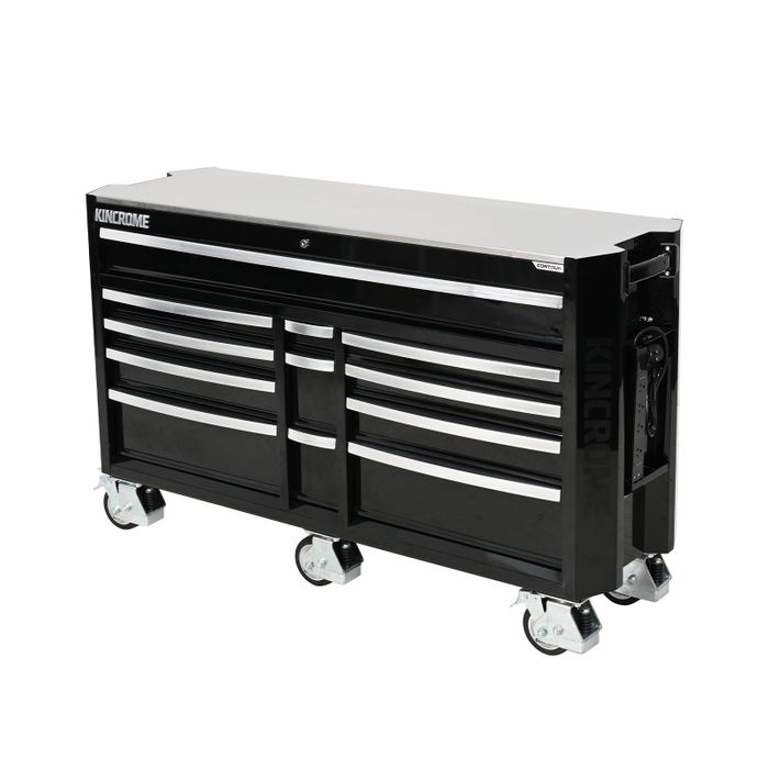 CONTOUR® storage comes standard with a range of premium features, including; the chamfered screen printed Kincrome side panels, ’Automatic Drawer Retention System (ADRS)’ locking system, heavy duty steel side handles, side folding work trays (including magnetic power boards), stainless steel worktops & heavy duty swivel castors for easy manoeuvrability.