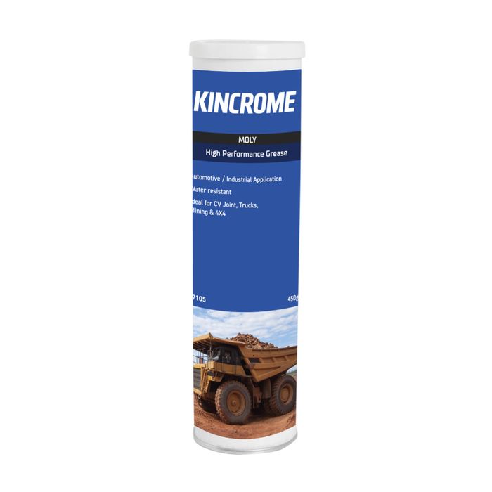 Kincrome ‘Moly’ Grease is an extreme duty, high temperature grease. It contains a blend of extreme pressure additives and molybdenum disulphide, formulated to provide the best shock load protection for automotive ball joints and constant velocity (CV) joints. This grease has excellent adhesion characteristics, which remain stable under heavy loads, is water resistant, oxidisation and corrosion resistant and is the preferred lubrication for wet and high dust applications including mining. Never mix greases, always flush or clean old grease out before adding new grease.
