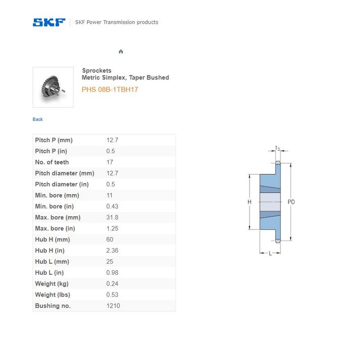 - SKF - 08B1/40/40H (1/2) SPROCKET 17 TEETH 1 ROW