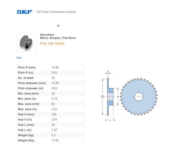 - SKF - 10B1/50/50H (5/8) SPROCKET 52 TEETH 1 ROW