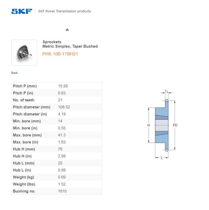 - SKF - 10B1/50/50H (5/8) SPROCKET 21 TEETH 1 ROW