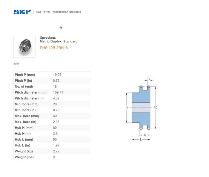 - SKF - 12B2 (3/4) SPROCKET 18 TEETH 2 ROW