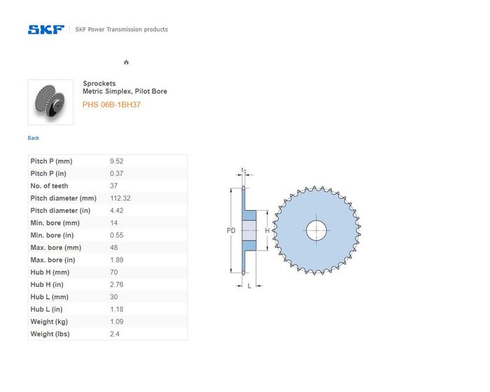 - SKF - 06B1 (3/8) SPROCKET 37 TEETH 1 ROW