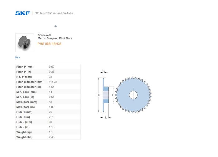 - SKF - 06B1 (3/8) SPROCKET 38 TEETH 1 ROW