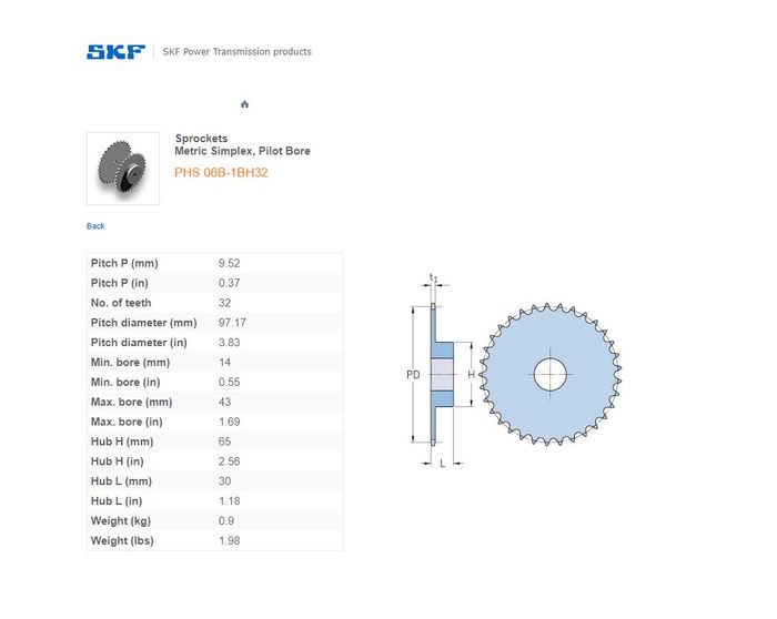- SKF - 06B1 (3/8) SPROCKET 32 TEETH 1 ROW