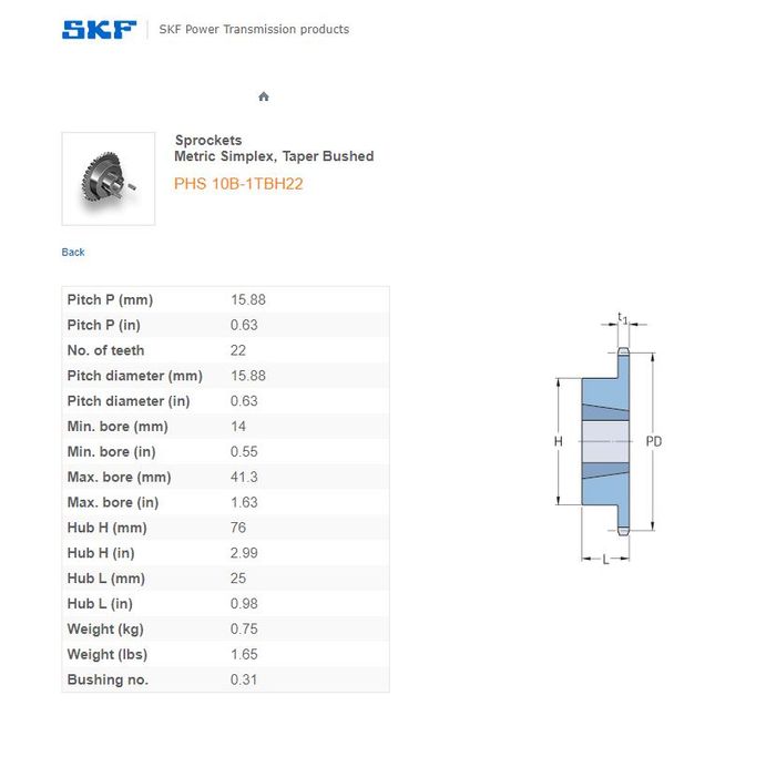 - SKF - 10B1/50/50H (5/8) SPROCKET 22 TEETH 1 ROW