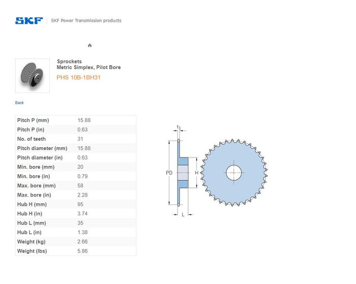 - SKF - 10B1/50/50H (5/8) SPROCKET 31 TEETH 1 ROW