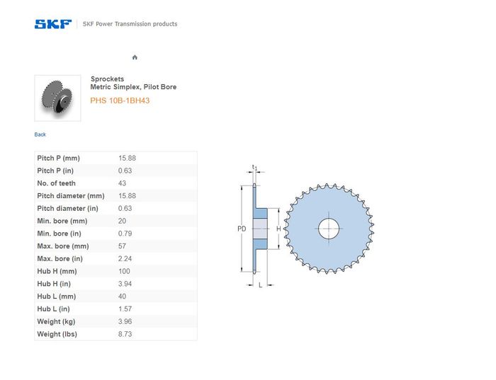 - SKF - 10B1/50/50H (5/8) SPROCKET 43 TEETH 1 ROW