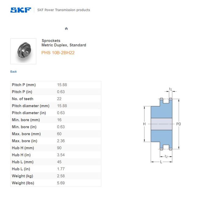 - SKF - 10B2 (5/8) SPROCKET 22 TEETH 2 ROW
