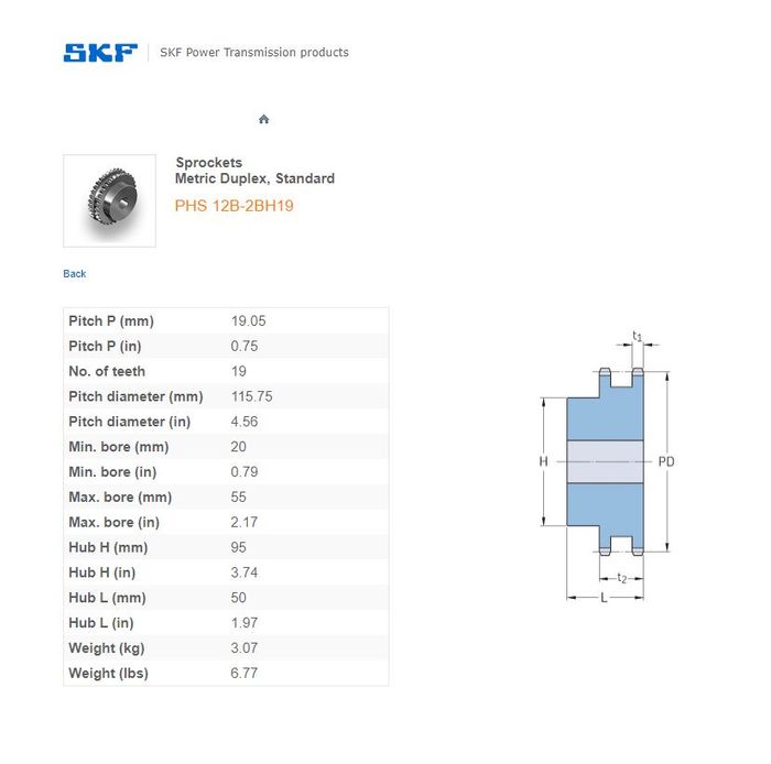SKF - 12B2 (3/4) SPROCKET 19 TEETH 2 ROW