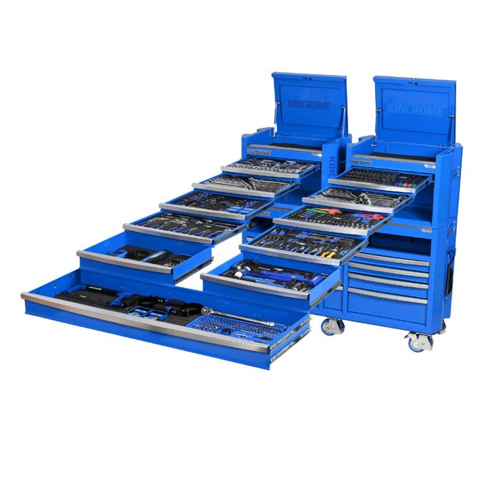CONTOUR® storage comes standard with a range of premium features, including; the chamfered screen printed Kincrome side panels, ’Automatic Drawer Retention System (ADRS)’ locking system, heavy duty steel side handles, side folding work trays (including magnetic power boards), stainless steel worktops & heavy duty swivel castors for easy manoeuvrability.