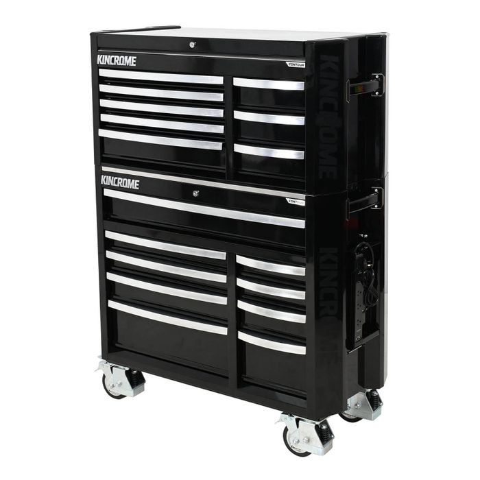 CONTOUR® storage comes standard with a range of premium features, including; the chamfered screen printed Kincrome side panels, ’Automatic Drawer Retention System (ADRS)’ locking system, heavy duty steel side handles, side folding work trays (including magnetic power boards), stainless steel worktops & heavy duty swivel castors for easy manoeuvrability.