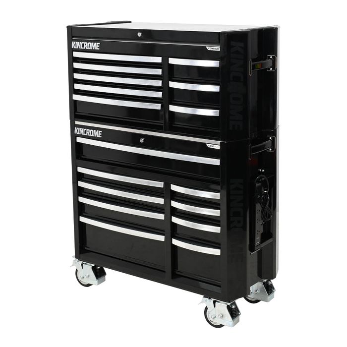 CONTOUR® storage comes standard with a range of premium features, including; the chamfered screen printed Kincrome side panels, ’Automatic Drawer Retention System (ADRS)’ locking system, heavy duty steel side handles, side folding work trays (including magnetic power boards), stainless steel worktops & heavy duty swivel castors for easy manoeuvrability.