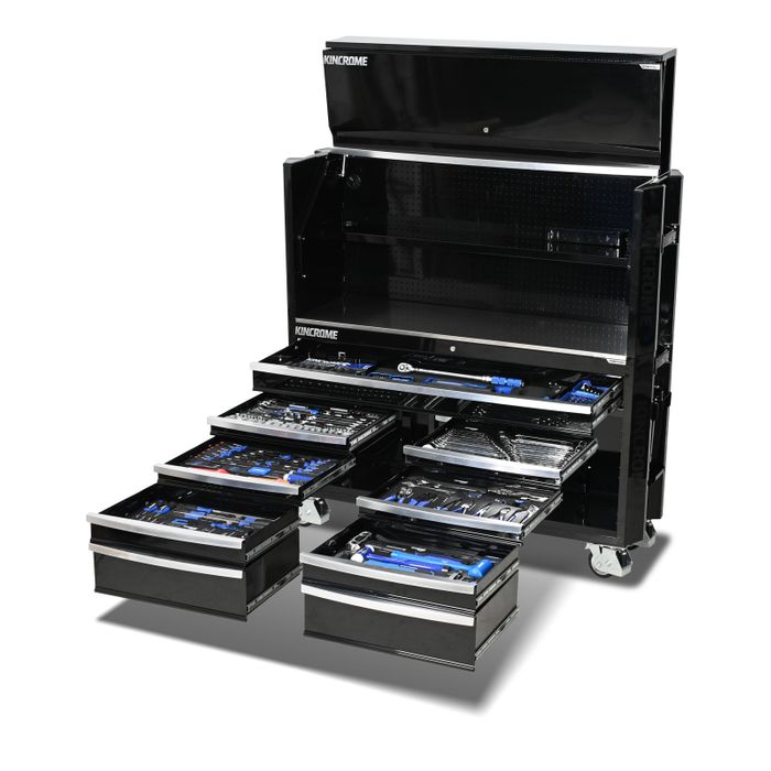 CONTOUR® storage comes standard with a range of premium features, including; the chamfered screen printed Kincrome side panels, ’Automatic Drawer Retention System (ADRS)’ locking system, heavy duty steel side handles, side folding work trays (including magnetic power boards), stainless steel worktops & heavy duty swivel castors for easy manoeuvrability.