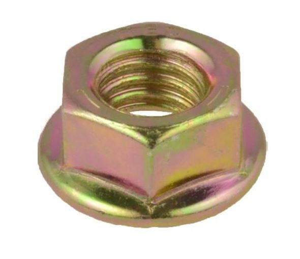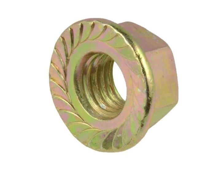 Hex Flange serrated nuts have a wide flange that acts as a fixed, integrated washer, which assists distribute the pressure of the nut over the part being secured. The serrated surface on the underside of the flange provides a locking mechanism by angling into the substrate to keep the nut from rotating in the loosening direction. Flange nuts also save time & money by removing the need for a washer to be added to each fastener assembly during installation.