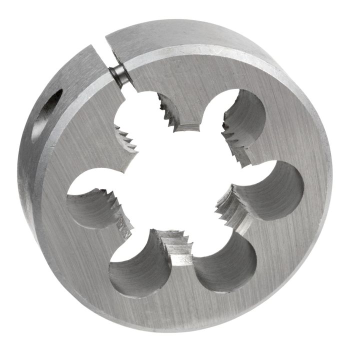 - Solid round die fits into adjustable guide or plain die stock handle