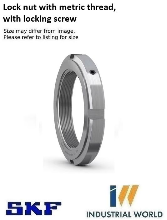 KMFE lock nuts with integral locking screw are designed to locate CARB toroidal roller bearings, sealed spherical roller bearings and sealed self-aligning ball bearings axially on a shaft. They reduce the cost of the shaft as no keyway is required. Installation with an integral set screw is quick and easy and no separate locking device is necessary. Maximum axial run-out locating face and thread 0.02 to 0.03 mm.