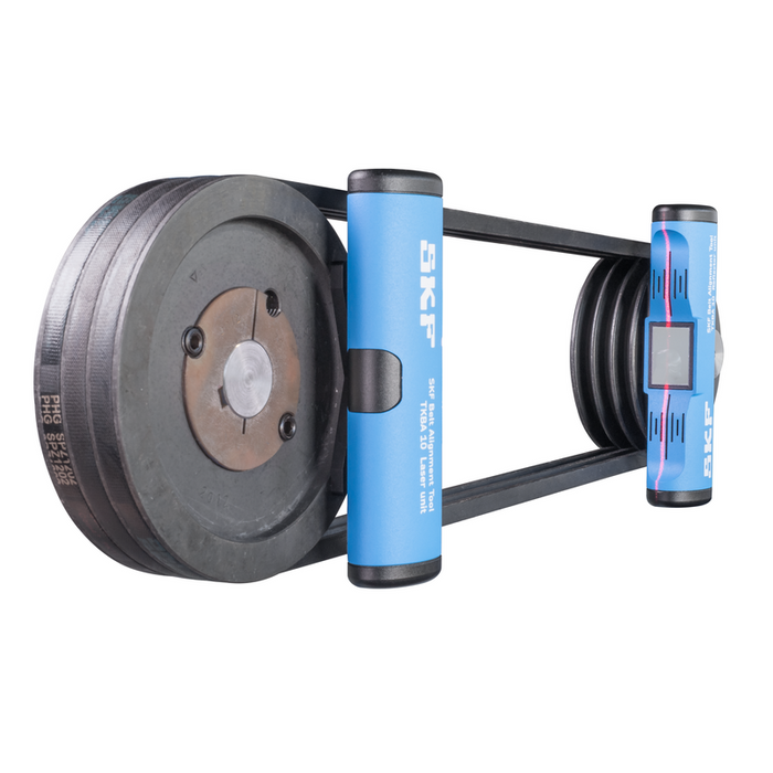 The SKF Belt Alignment Tool TKBA 10 allow pulleys and sprockets to be aligned on the side face. The unit magnetically attaches to the inside or outside face of almost any belt pulley or chain sprocket and has no small parts or targets that can get lost. A laser line is projected from the transmitter unit to the reflector unit mounted on the opposite pulley. A reference line on the reflector unit directly indicates the offset and vertical angle misalignment. The reflected laser line shown on the transmitter unit shows the horizontal angle misalignment of all three.