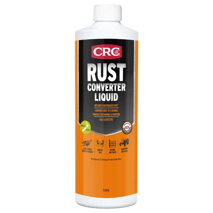 CRC Rust Converter is a unique fast drying coating formulated for treatment of rusted surfaces. It stops rust instantly and prevents future rusting. CRC Rust Converter neutralises rust and transforms it to a tough black primer that binds to the surface and provides a waterproof barrier for effective long lasting rust protection. No more sandblasting, heavy scraping, or grinding. CRC Rust Converter can be used as a finish coat or can be painted over.