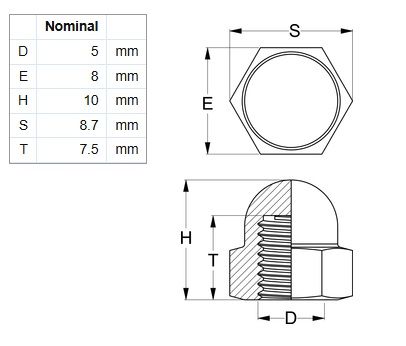- Dome Hex Nut - 316 SS - M5 (Box=100)