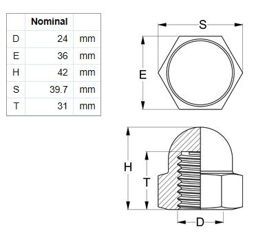 Dome Hex Nut - 316 Stainless Steel - M24 (Box=25)